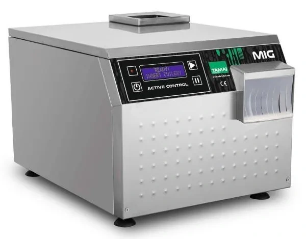 Automatická leštička príborov MIG EVO od spoločnosti TAMAI je automatický model na pult alebo stôl s novým elektronickým ovládacím panelom s LCD displejom. Je vhodná pre malé a stredné prevádzky s kapacitou do 120 stoličiek. Stroj pomocou biodegradovateľného eko kukuričného granulátu, vibrácií a vysokej teplote vyleští príbory do dokonalého lesku.