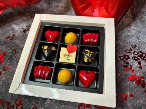 Biely obal na 9 ks praliniek s transparentným vekom – CHOCOLATE WORLD