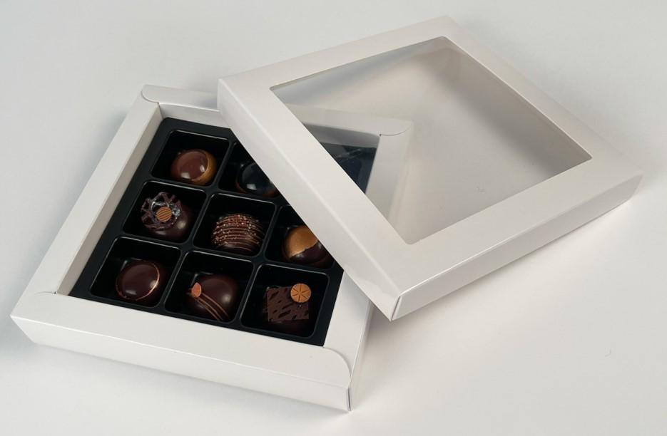 Biely obal na pralinky od spoločnosti CHOCOLATE WORLD disponuje priehľadným vekom a vnútornou vložkou pre 9 ks praliniek. Ideálne pokiaľ chcete vaše výrobky niekomu darovať alebo ich potrebujete komfortne preniesť.