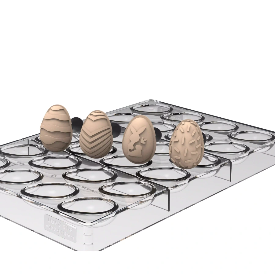 Sada obsahuje 1 formu Tritan Uovo 01-P, 4 silikónové pečiatky s plastovou rukoväťou na vytváranie originálnych dekorácií s veľkonočnou tematikou. 4 originálne veľkonočné vzory boli navrhnuté v spolupráci s Llucom Crusellasom, víťazom súťaže World Chocolate Masters 2022.