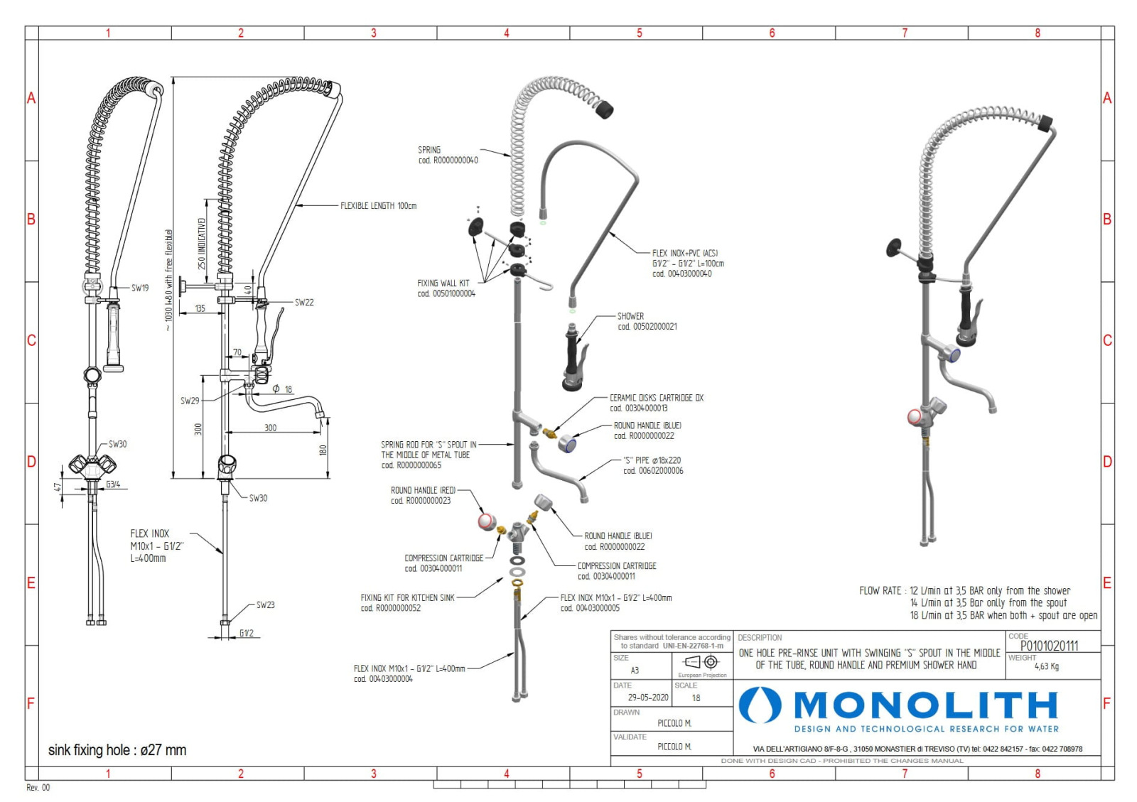Stojanková tlaková sprcha ERA, ramienko s pákou od spoločnosti MONOLITH ideálna pre umývacie stoly. Pripojenie na teplú a studenú vodu, montáž do stola (drezu).